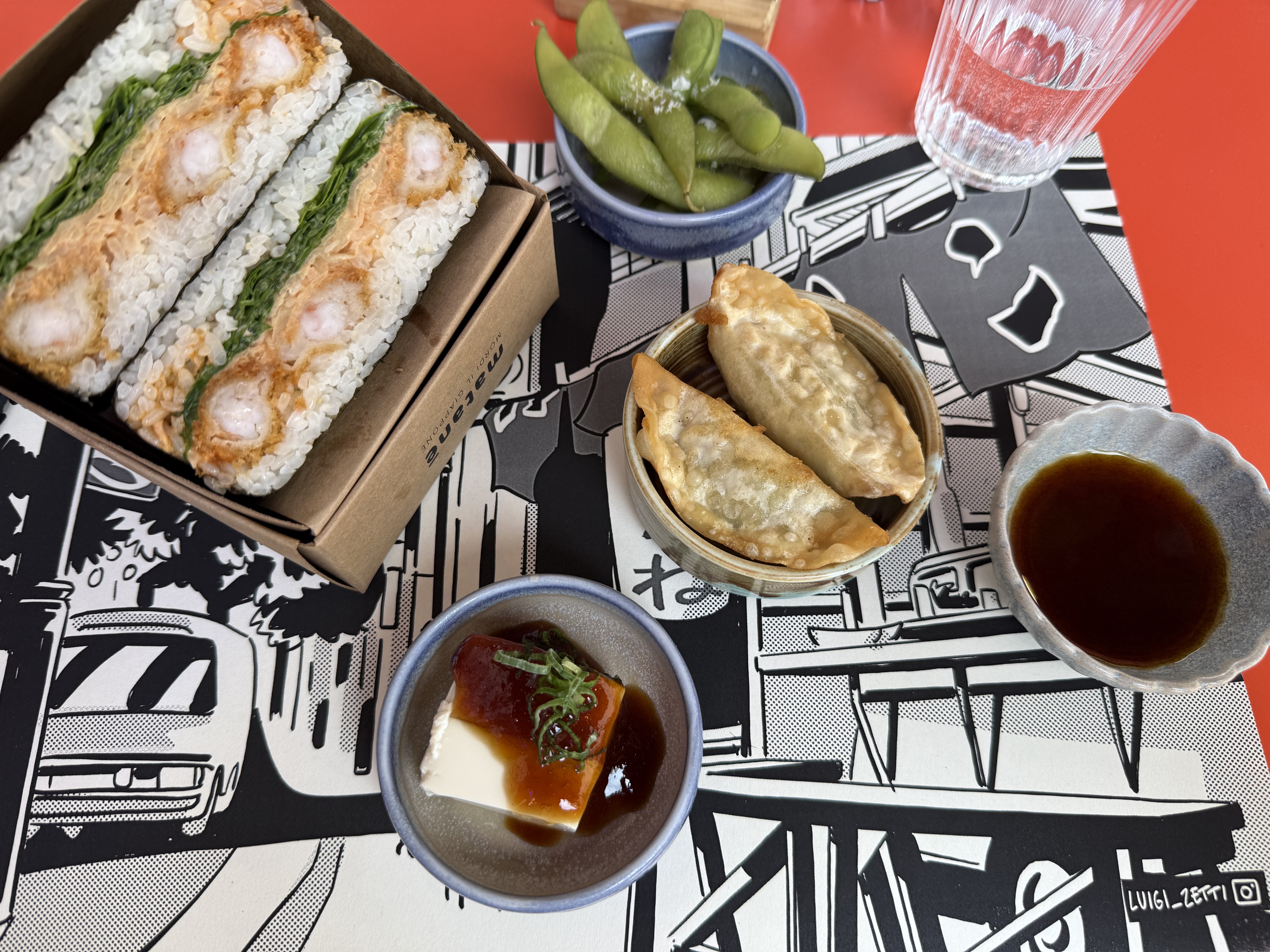 Ho scelto il set lunch Onigirazu. Un piatto con: Edamame, totalmente dimenticabili. Servono più a passare il tempo che a dare gusto. Hiyayakko vegan, tofu freddo con condimenti. Gyoza di pollo, cotti bene, croccanti ai bordi, ripieno che però sa un po’ di catena. Forse non sono industriali, forse sono solo tristi. E poi lui: l’Onigirazu Ebi Fry. La loro specialità.